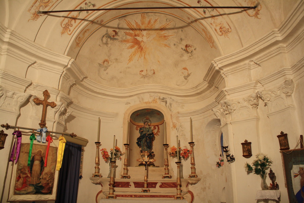 La chiesetta edificata nel XVII secolo, gravemente danneggiata durante la seconda guerra mondiale, e successivamente completamente restaurata, è posta al centro della borgata Piazza, con panorama mozzafiato che le rende meta ambita di molte coppie di sposi. L’interno della chiesa è sobrio e presenta l’altare in pietra di Verezzi, con forme moderne, geometriche.